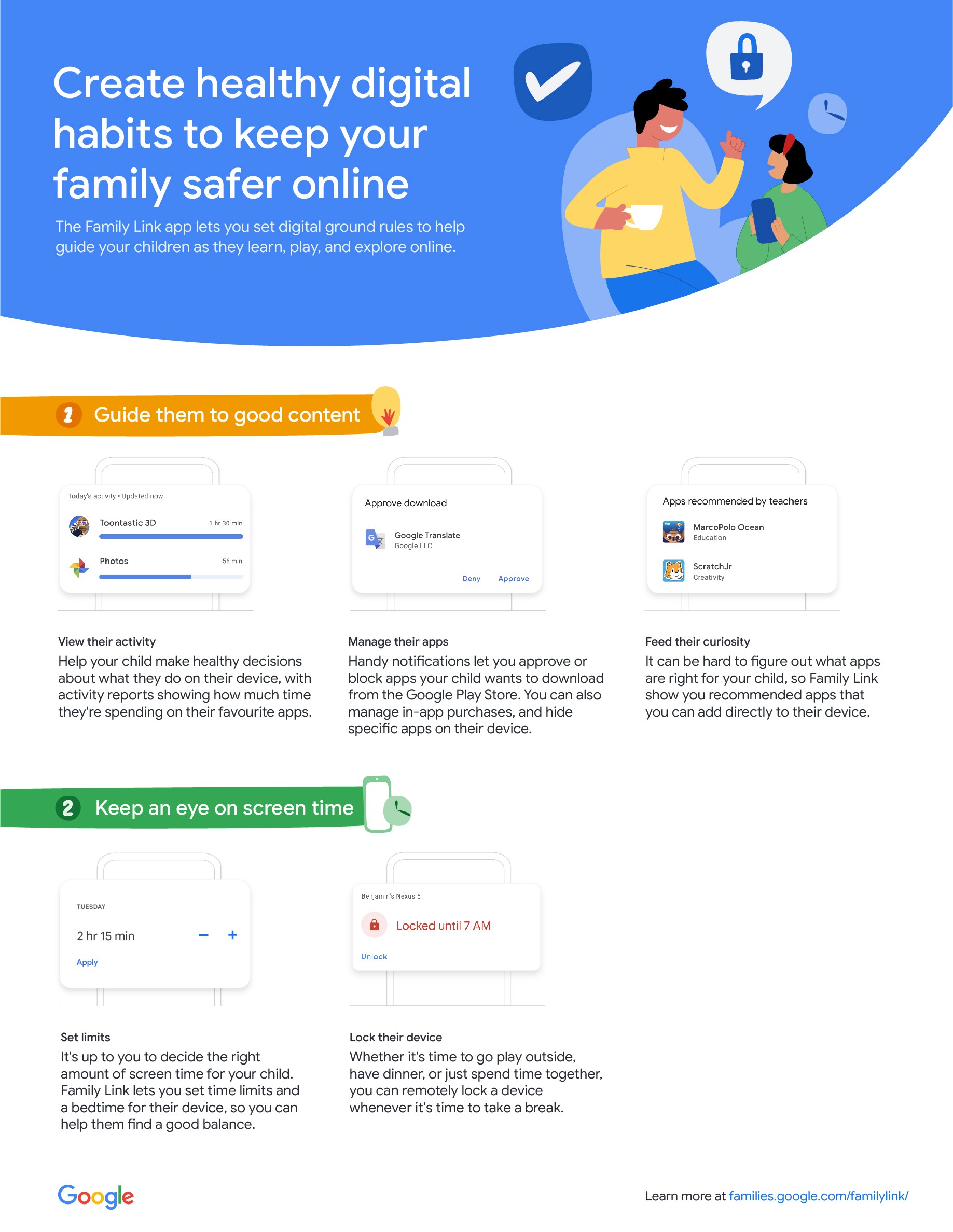 As part of the families.google umbrella, we also designed three infographics for a (1) social survey result, (2) the Family Link app and (3) an educational resource the things parents need to know to get your family’s tech journey off on the right foot.
